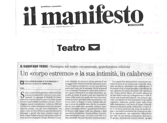 “Da qualche anno sono alla ricerca di una nuova ragione di teatro. Dopo una lunga sperimentazione nelle estetiche delle arti sceniche attraverso le tecnologie il corpo aveva assunto una funzione marginale nella composizione dell’apparato spettacolare. La perdita del corpo inevitabilmente ha determinato in me uno stato di crisi, un disorientamento, sul piano creativo e non solo. Da questa crisi prende forma il mio viaggio di ora, dove non c’è il corpo dell’attore in cui trasferire registicamente un “progetto”. C’è invece un viaggio introspettivo che fa emergere il mio corpo, i suoi conflitti, la sua patologia, la sua condizione estrema con l’ obesità, la voce malata, con l’obliquo sguardo sul mondo. Fragilità, buio, silenzio e al tempo stesso grido. Ho bisogno di un teatro che sia il “mio” teatro. Dalla scrittura all’esecuzione mi catapulto senza inibizioni dentro la mia esperienza, origini, ricordi, vergogne, per portare a galla materiali che divengono denuncia e autodenuncia. A difesa della diversità in tutte le sue forme, razziale, sessuale, politica, religiosa, psicologica, fisica. Questo il tema di Picchì mi guardi si tu si masculu, un monologo scritto sempre in calabrese, in cui indago, attraverso la mia sessualità, nei conflitti di questo “corpo estremo” che instancabilmente porto in giro. E dove mi inoltro nel paesaggio degli istinti, in cui ricostruisco gli sguardi che si impigliano, i malesseri, i piaceri, le esclusioni, le negazioni, la voluttà, descrivendo con crudezza un’esperienza vitale per un artista e il suo destino.In scena con me il corpo, la voce e la musica di Peppe Voltarelli, coprotagonista della mia performance”.