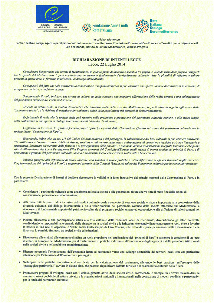 Con la presente Dichiarazione di intenti si desidera riconoscere la validità e la forza innovativa dei principi espressi dalla Convenzione di Faro, e in particolare: