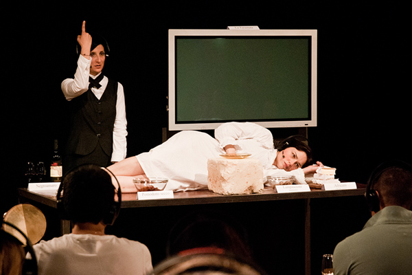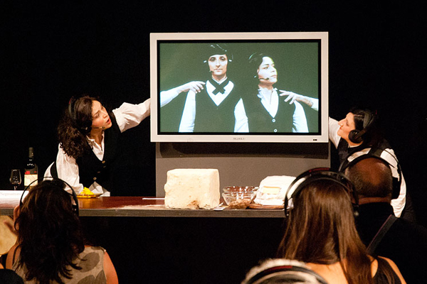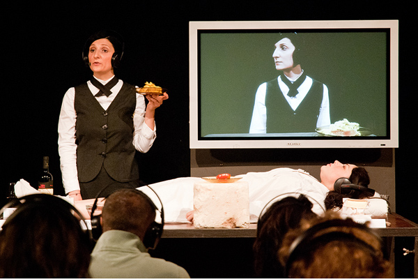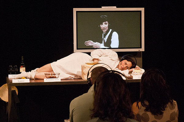 The audience is received and isolated from the rest of the other people through headphones and is invited to discover through some typical dishes from the land of Salento, its tradition, its inhabitants, also thanks to the use of technology. A big plasma TV doubles the actors and the headphones immerse the listener in the rhythms and sounds of our South.