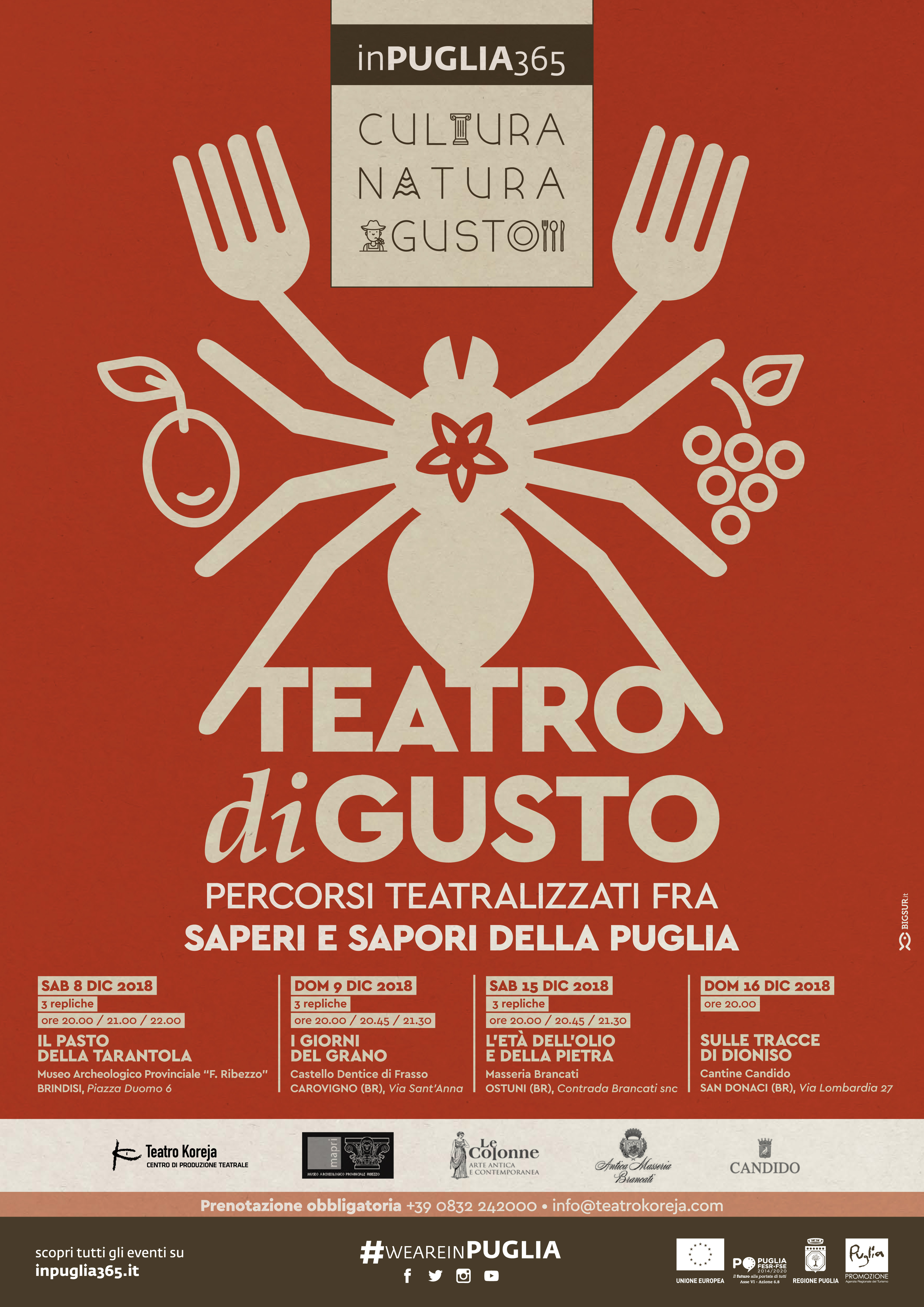 TEATRO DI GUSTO è una rassegna del Teatro Koreja dedicata al binomio teatro-cibo. Il programma prevede la messa in scena di performance teatrali esperenziali in luoghi di interesse culturale e storico della provincia di Brindisi. Degustazioni, visite guidate e racconti interattivi accompagneranno lo spettatore alla scoperta della storia, delle tradizioni e della cultura enogastronomica del territorio.